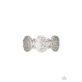 Infused with dainty silver beads, floral silver frames are threaded along stretchy bands around the wrist for a whimsical look.