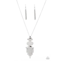 A hammered silver oval frame is flanked between two asymmetrical silver frames at the bottom of a lengthened silver chain. Hammered silver pendulums swing from the bottom of the stacked pendant, adding playful movement to the rustic centerpiece. Features an adjustable clasp closure.