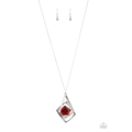Dotted with glassy white rhinestones, antiqued silver bars twist and coil around a pentagonal red gem. The abstract pendant swings from the bottom of a lengthened silver chain for a modern look. Features an adjustable clasp closure.