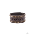 Brown laces are threaded through the center of a brown leather band that has been studded in brass accents, creating a rustic centerpiece around the wrist. Features an adjustable snap closure.