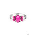 An oversized oval Fuchsia Fedora bead is flanked by pairs of stacked Fuchsia Fedora square beads across the center of a hammered silver bangle-like bracelet, creating a bold pop of color atop the wrist. Features a hinged closure.