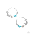 Fluttering along the bottom curve of an oversized sleek silver hoop, a kaleidoscope of varying-sized butterflies including airy silver ones, a Capri-painted and white rhinestone-encrusted bodied butterfly, and a light peach rhinestone-encrusted butterfly create a whimsical statement along the ear. Earring attaches to a standard post fitting. Hoop measures approximately 2 1/2" in diameter.