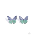 A silver-studded and textured silver butterfly with dark blue paint on its top wings and Mint paint on its lower wing's flutters along the ear for a colorfully chic look. Earring attaches to a standard post fitting.