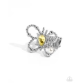 Dotted in silver studs of varying sizes and a solitaire white pearl, an oversized silver butterfly with an upside-down yellow teardrop body flutters atop airy silver bands, resulting in a dazzling statement piece. Features a wide stretchy band for a flexible fit.