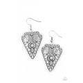 A gray bead is pressed into a silver arrowhead frame embossed in a tribal arrow pattern for an indigenous look. Earring attaches to a standard fishhook fitting.