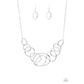 Featuring a subtle hammered finish, a collection of asymmetrical silver rings join into a stationary pendant below the collar for a bold look. Features an adjustable clasp closure.