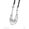 Replacing a traditional chain, a knotted, silky black ribbon gives way to textured silver discs, dark gray classic and baroque pearls, rope-textured silver beads, silver tabs, silver cable chain strands, and chunky silver curb chain strands that cascade, intermix, and layer below the neckline for an opulent one-of-a-kind look.