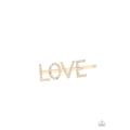 Encrusted in glassy white rhinestones, glistening gold letters spell out the word, "LOVE," across the front of a gold bobby pin for a lovable look.