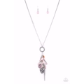 Varying glassy, pearly, opaque, and shell-like finishes, a whimsical collection of pink crystal-like and classic beads delicately cluster along a silver chain swinging from the bottom of a textured silver ring. Mismatched silver beads, classic silver chains, and a decorative silver locket-like bead are added to the fringe, creating an enchanting tasseled pendant at the bottom of a classic silver chain. Features an adjustable clasp closure.