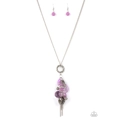 Varying glassy, pearly, opaque, and shell-like finishes, a whimsical collection of crystal-like and classic Amethyst Orchid beads delicately cluster along a silver chain swinging from the bottom of a textured silver ring. Mismatched silver beads, classic silver chains, and a decorative silver locket-like bead are added to the fringe, creating an enchanting tasseled pendant at the bottom of a classic silver chain. Features an adjustable clasp closure.