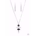 Flared silver bars swing from the bottom of a mismatched and stacked collection of oval black, flat white, and teardrop black stones, resulting in an earthy pendant at the bottom of an extended silver chain. Features an adjustable clasp closure.