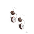 An earthy collection of brown wood and white stone discs are threaded along a silver hoop, linking into a trendy lure for an artisan inspired fashion. Earring attaches to a standard fishhook fitting.