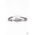 Strands of gray suede knot around a shimmery silver feather charm, creating a seasonal pendant atop the wrist. Features an adjustable clasp closure.