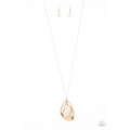A glowing white cat's eye stone is nestled inside an asymmetrical gold frame, creating a colorful pendant at the bottom of a dainty lengthened gold chain for a whimsical flair. Features an adjustable clasp closure.