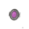 An oval purple stone is pressed into the center of an antiqued silver frame radiating with striking linear texture. The colorful centerpiece is held in place with faux-pronged silver studs, creating a bold tribal-inspired statement. Features a stretchy band for a flexible fit.