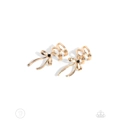 Dotted with a solitaire black rhinestone, a loopy gold bow is tied at the end of a crisscrossed lace of gold for a ballet-inspired one-size-fits-all cuff.