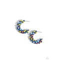 A colorful collection of royal blue, yellow, light blue, and orange seed beads are wrapped along the outside curve of a shiny, silver hoop by shimmery silver wire for a handcrafted, carefree finish. A shiny silver ball is affixed to the end of the hoop, reminiscent of a barbell fitting. Earring attaches to a standard post fitting. Hoop measures approximately 1" in diameter.