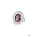 Encrusted in dainty white rhinestones, a frilly silver frame spins around a glowing purple moonstone center for a regal look. Features a stretchy band for a flexible fit.