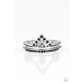 Dotted in glittery black rhinestones, antiqued silver bars bend into a stacked geometrical frame. Dainty hematite rhinestones are sprinkled across the triangular center for an edgy finish. Features a dainty stretchy band for a flexible fit.