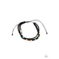 Two strands of dainty black seed beads, highlighted with a strand of brightly colored beads, form a simple accent around the wrist. Features an adjustable sliding knot closure.