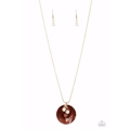 Dainty pearls and wooden beads dangle over a smooth oversized brown shell. Features an adjustable clasp closure.