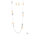 Featuring an opaque finish, glassy brown beads join hammered silver frames along a shimmery silver chain, creating a colorful collision across the chest. Features an adjustable clasp closure.