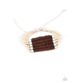 Infused with silver cube beads, brown twine-like cording knots and weaves around strands of white cording, creating a colorful centerpiece. Features an adjustable sliding knot closure.