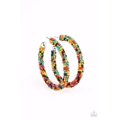 A dainty collection of turquoise, black, yellow, orange, and red seed beads colorfully adorns a classic hoop for a beautifully beaded look. Earring attaches to a standard post fitting. Hoop measures approximately 2" in diameter.