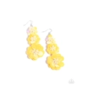 Featuring yellow seed bead centers, a collection of yellow iridescent sequin flowers gradually increase in size as they whimsically shimmer and shine down the ear. Earring attaches to a standard fishhook fitting. Due to its prismatic palette, color may vary.