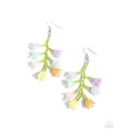 Blooming from a vine of green seed beads, a collection of multicolored opaque tulips, with clear tulip centers, cascades around the ear for a bright bouquet of color. Earring attaches to a standard fishhook fitting.