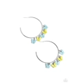 Attached along an oversized silver hoop, various blue and yellow butterflies flutter and fly along the ear for a whimsical finish. Earring attaches to a standard post fitting. Hoop measures approximately 2 1/4" in diameter.