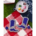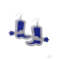 Dazzling blue and white rhinestones set in the shape of cowboy boots, complete with a spurred design for a whimsical Western touch, sway playfully from the ear. Earring attaches to a standard fishhook fitting.
