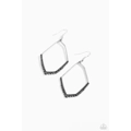 A shiny silver bar asymmetrically bends into an abstract geometric shape. Separated by silver studs, a smoldering border of smoky hematite rhinestones gradually increases in size along the bottom of the frame for an edgy finish. Earring attaches to a standard fishhook fitting.
