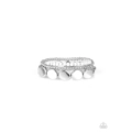 Mismatched silver and white beads and round silver accents are threaded along stretchy bands, creating colorful layers around the wrist.