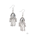 Dotted with dainty white rhinestones, silver teardrop frames cascade from the bottom of an oversized white teardrop gem encrusted frame, creating a timeless chandelier. Earring attaches to a standard fishhook fitting.