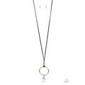 Infused with a pair of classic silver beads and a white rhinestone encrusted accent, lengthened black leather cording knots around a bold silver hoop for a knockout look. A lobster clasp hangs from the bottom of the design to allow a name badge or other item to be attached. Features an adjustable clasp closure.