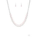 A strand of glittery pink crystal-like cube beading joins a classic strand of silver chain below the collar, creating refined layers. Features an adjustable clasp closure.