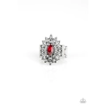 Dotted in dainty white rhinestones, silver petals radiate from a regal red marquise shaped rhinestone center for an edgy look. Features a stretchy band for a flexible fit.