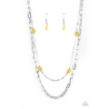 Elongated silver ovals link together to create an industrially edgy sheen below the collar. A slightly daintier version of the same style of chain layers above, dotted with yellow seed bead flowers with pink centers that add playful pops of color along the way. Features an adjustable clasp closure.