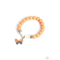 Polished orange and white stone beads are threaded along a stretchy band, with a sprinkle of metallic accents. A butterfly charm, featuring orange stone beads and swirls of silver filigree, swings from the design in a whimsical finish.