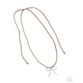 Infused with silver beads at its ends, a lengthened strip of brown suede wraps around the neck, creating a layered necklace. A glistening silver loopy and curled bow glides along the center of the design, creating an adjustable, refined display.