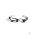 Blooming atop textured, airy silver vine-like accents that twist and curl atop the wrist, intricately sculpted silver roses in varying sizes stand out atop a silver cuff, creating a vintage-inspired, botanical display.
