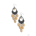 Studded silver filigree vines across the bottom of a decorative teardrop frame, blooming into a whimsical floral pattern. A single brown bead swings from the top of the frame, colorfully complementing the round and oval beaded fringe dancing from the bottom of the display. Earring attaches to a standard fishhook fitting.