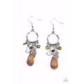 An earthy compilation of wooden teardrop beads, dainty Olive Branch and opal crystal-like accents, and mismatched silver accents cascade from the bottom of a dainty silver hoop, resulting in a whimsical fringe. Earring attaches to a standard fishhook fitting.