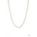 A thick strand of glistening gold box chain drapes across the chest for a bold look. Features an adjustable clasp closure.