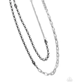 A strand of white rhinestones in black-painted square fittings collides with a silver paperclip chain to create an abstract blend of grit and glitz. A larger-sized matching strand layers underneath the daintier strand, perfectly balancing the contrasting design. Features an adjustable clasp closure.