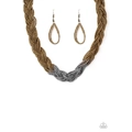Strands of brass seed beads create an indigenous braid below the collar. The brass seed beads gradually morph into metallic silver beads at the center for a chic contrasting look. Features an adjustable clasp closure.