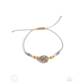 Infused along brown cording, a coastal collection of turquoise stone beads, yellow seed beads, silver studs, silver textured discs, multicolored clay discs, and a conch shell wrap around the ankle for a colorful, seasonal statement. Features an adjustable sliding knot closure. As the stone elements in this piece are natural, some color variation is normal.