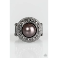 A pearly gunmetal bead is pressed into the center of a stacked gunmetal frame. Infused with classic gunmetal studs and filigree detail, faceted gunmetal studs spin around the pearly center, adding edgy shimmer to the dramatic centerpiece. Features a stretchy band for a flexible fit.
