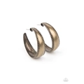 Bordered in a flattened studded pattern, an antiqued brass hoop curls into a dainty hoop for a rustic flair. Earring attaches to a standard post fitting. Hoop measures approximately 1 1/2" in diameter.